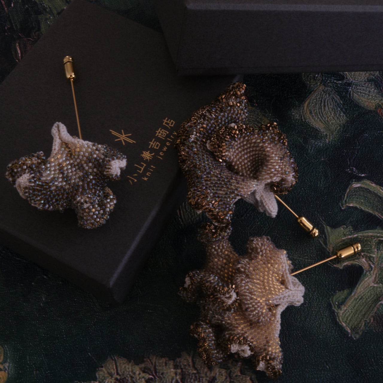 ハットピンときのこを接続している金具は「きのこ虫」をモチーフにしたオリジナルのパーツです。