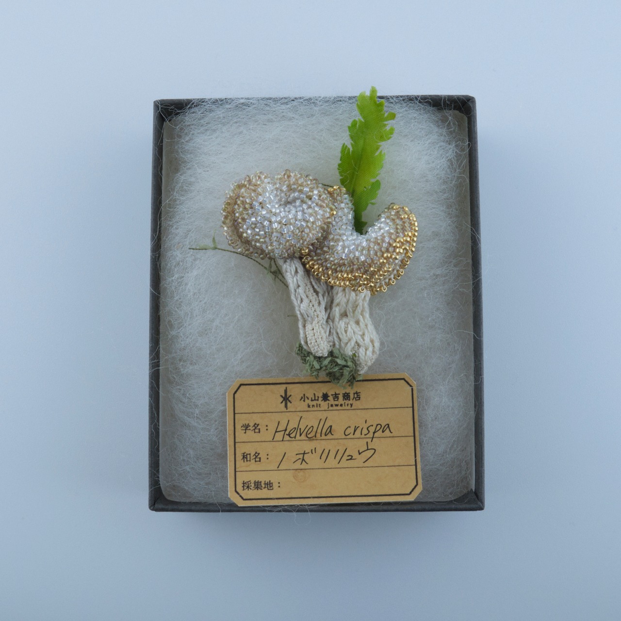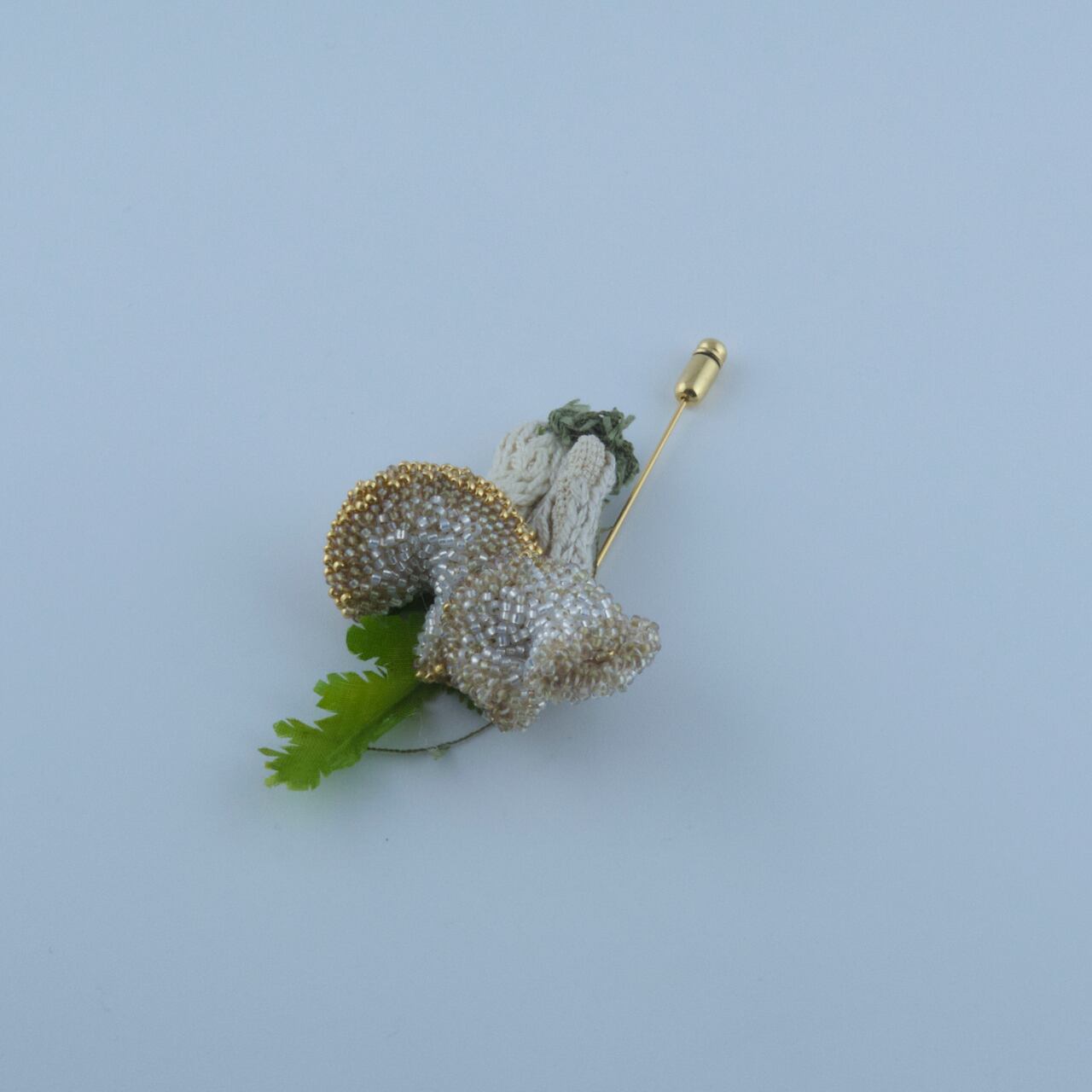 ブローチ金具は針の長いハットピンタイプを使用しています。ハットピンときのこを接続している金具は「きのこ虫」をモチーフにしたオリジナルのパーツです。