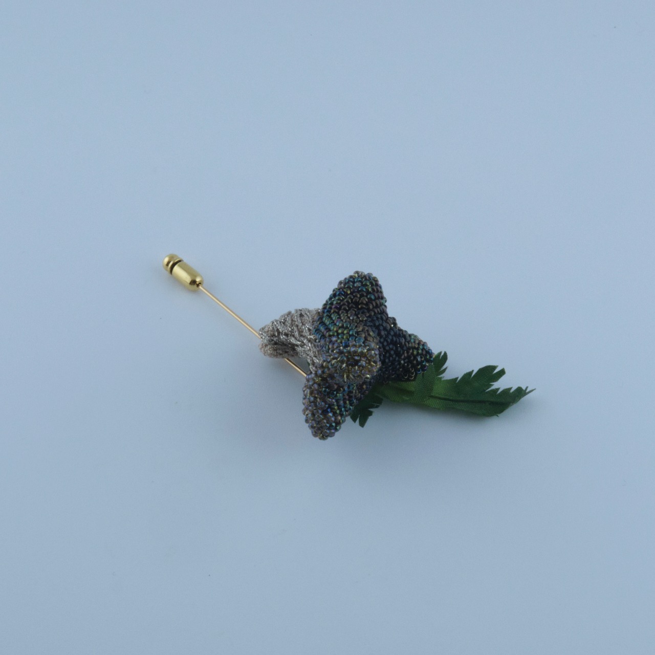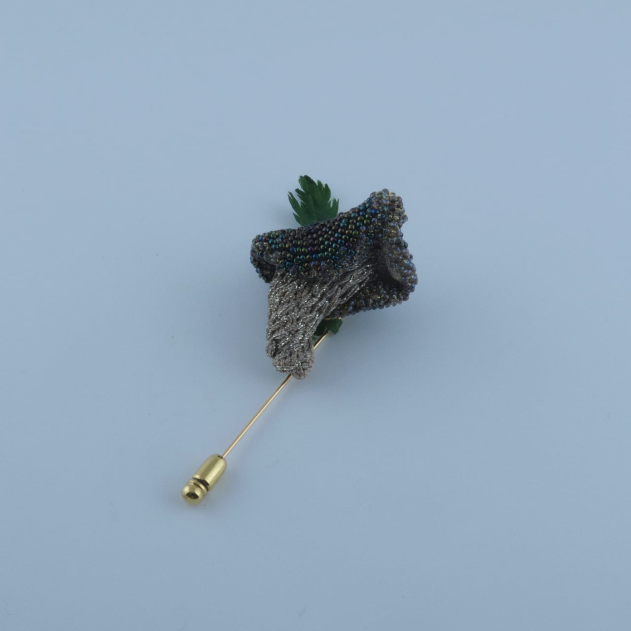 ブローチ金具は針の長いハットピンタイプを使用しています。ハットピンときのこを接続している金具は「きのこ虫」をモチーフにしたオリジナルのパーツです。