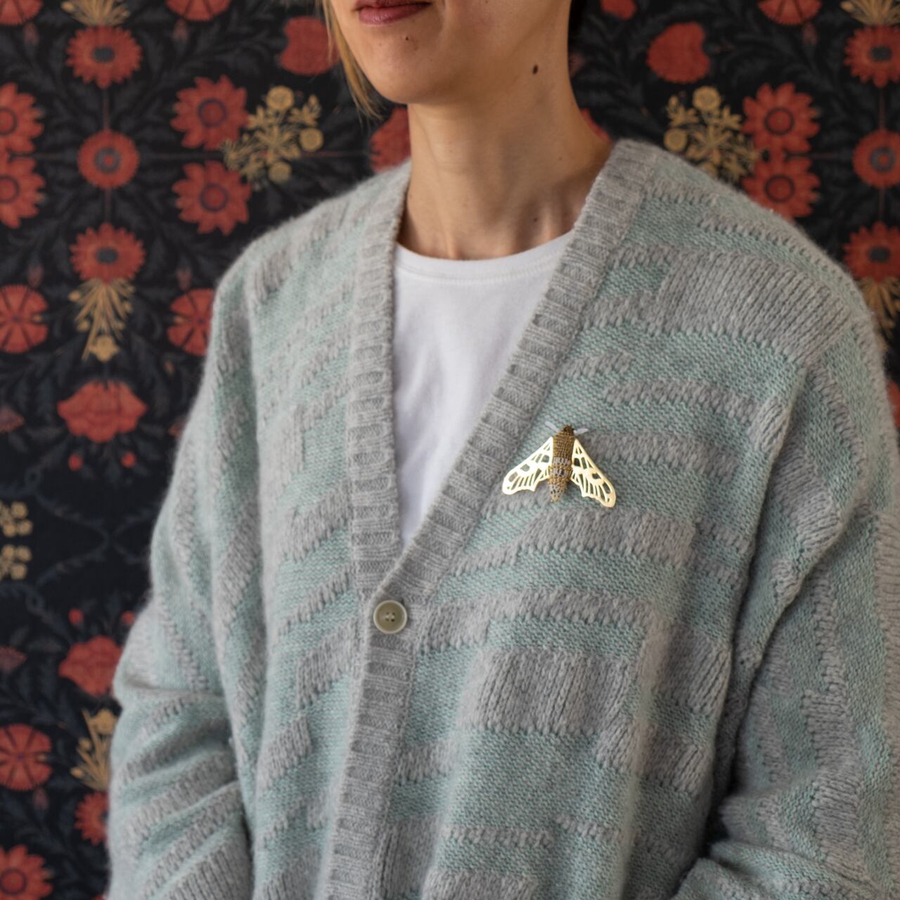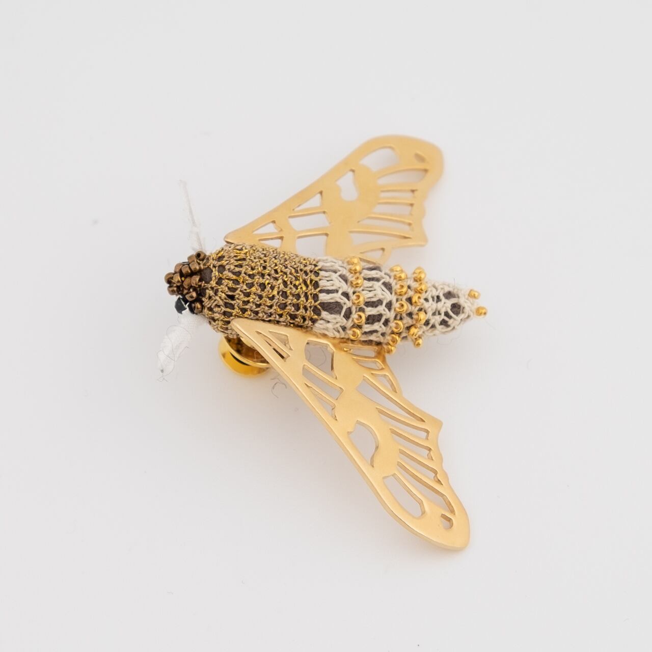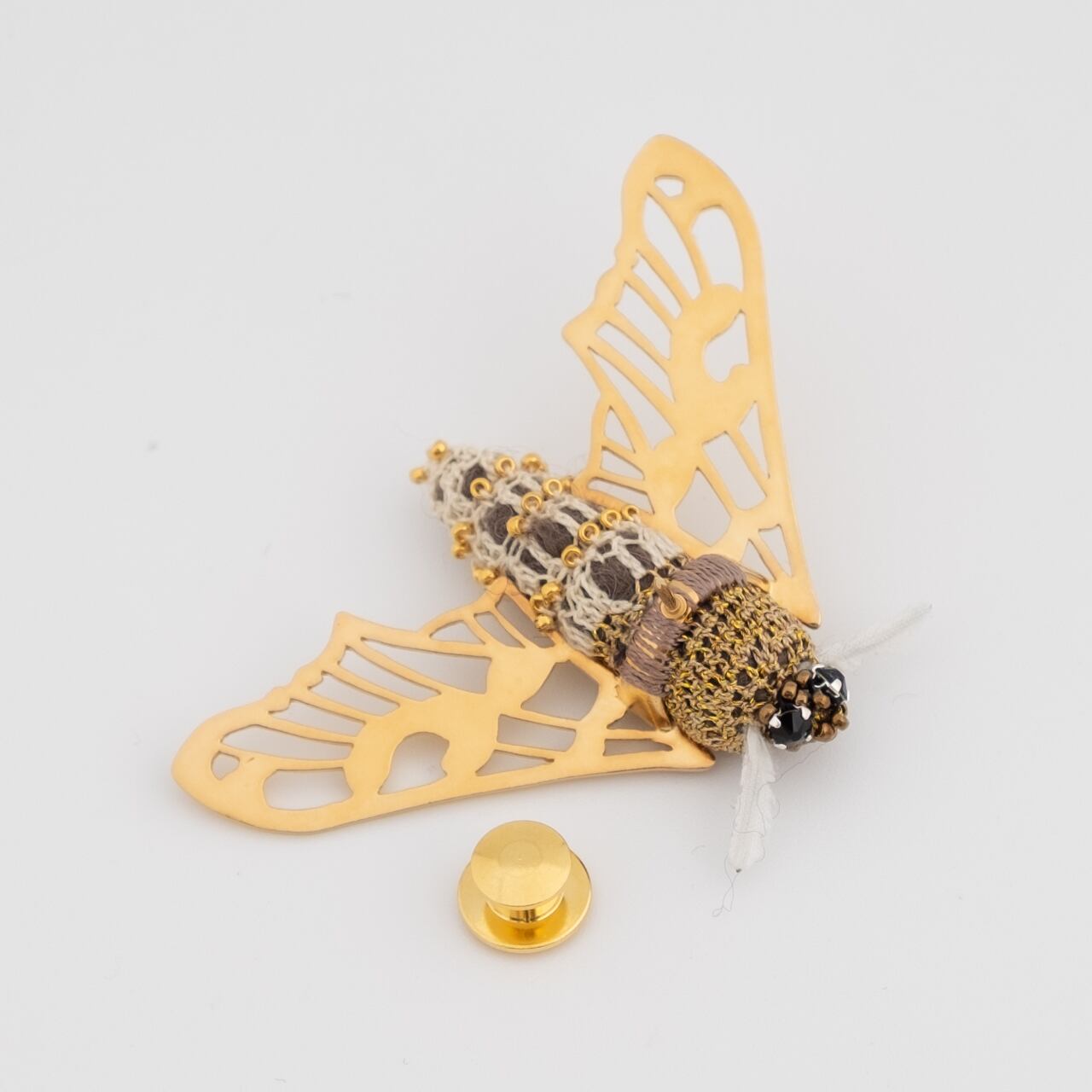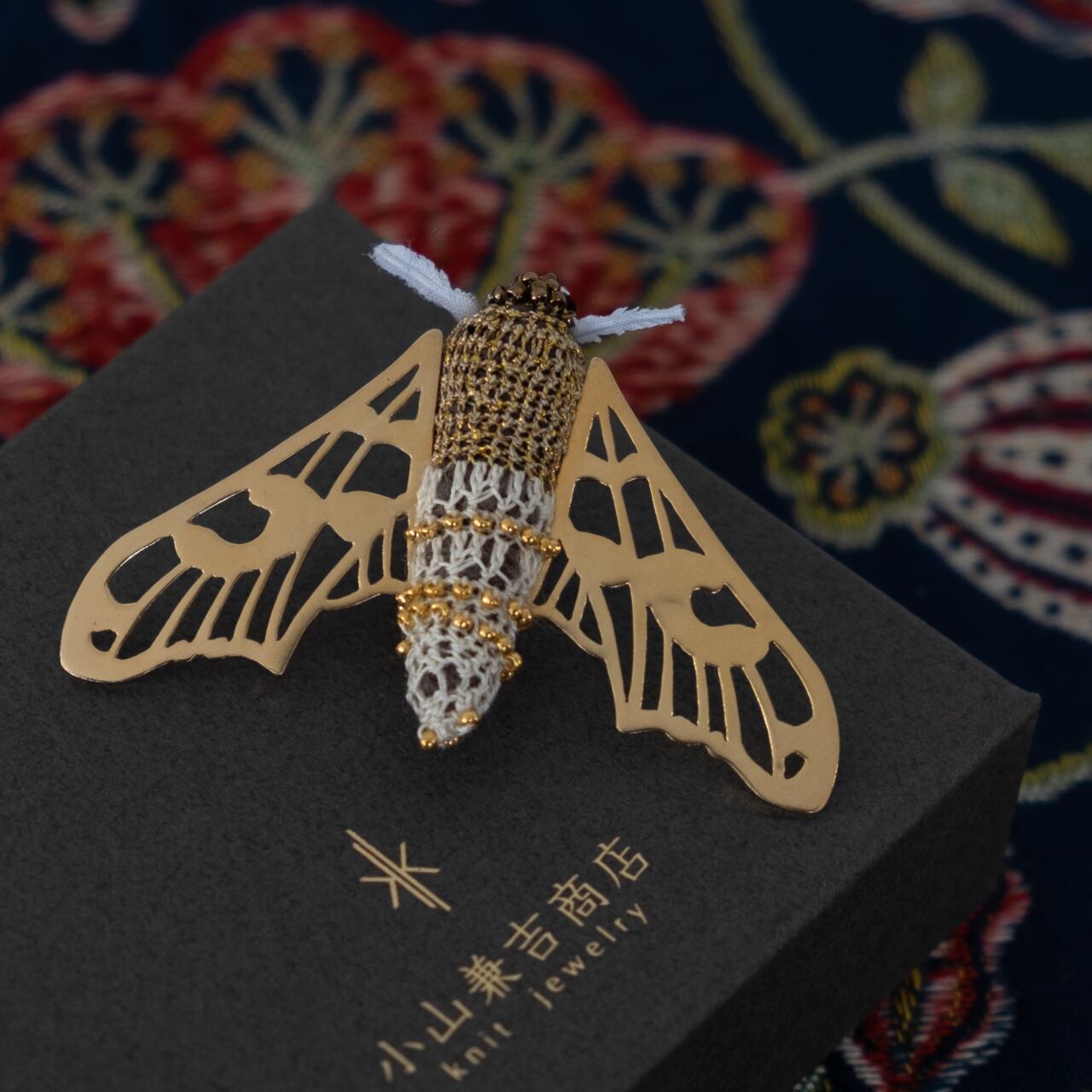 蛾のボディはコットン糸やラメのミシン糸、ガラスビーズで編み、羽はシルバー925です。