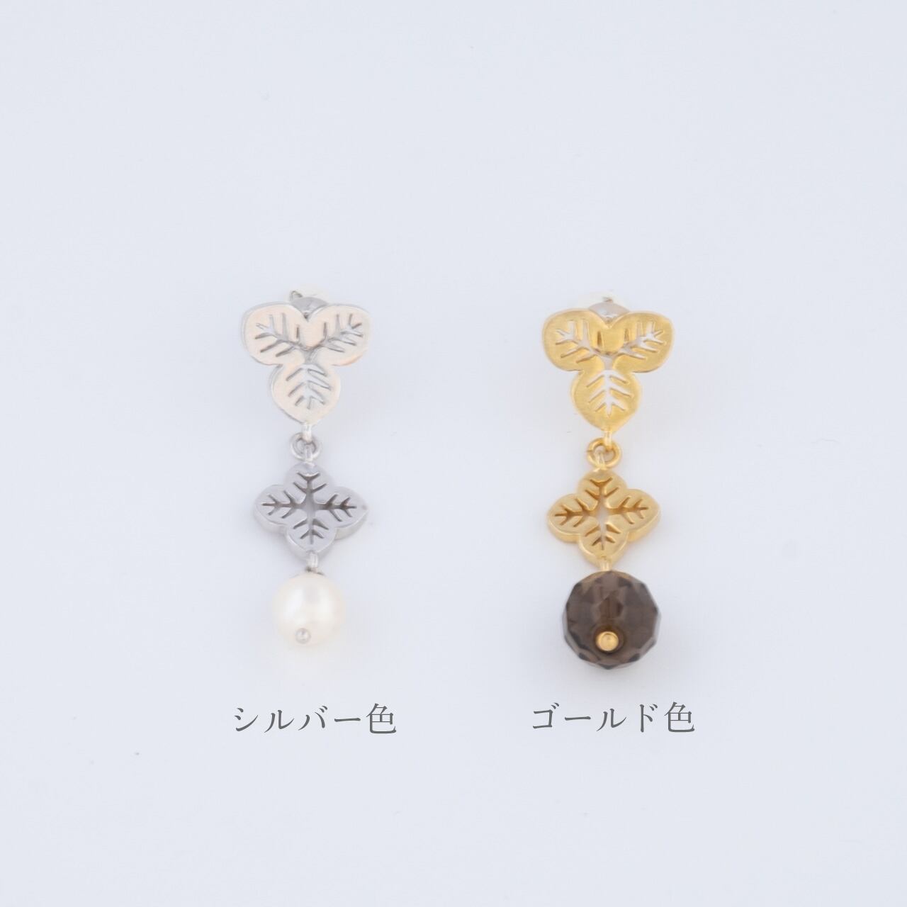 シルバー色には淡水パール、ゴールド色にはスモーキークオーツを使用。