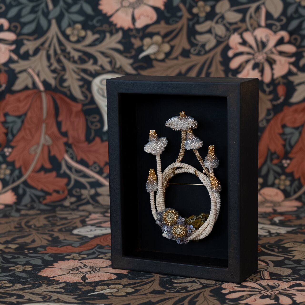 カサが開く前のきのこ、グングン柄が伸びて開き切ったきのこなど、成長過程がわかる群生です。大きめで迫力のあるブローチなので、お花などのコサージュに飽きてしまった方にいかがでしょうか。